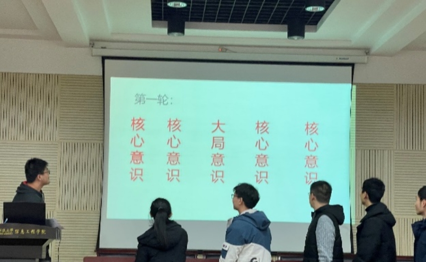 寓教于乐,趣味游戏提认知。该环节采用趣味游戏这样较为新颖的方式来让更多的同志理解关键词并且参与其中。首先设置一组关键词,如:“核心意识”“大局意识”为一组词语,“全面从严治党”“全面依法治国”为一组词语,“深化改革”“扩大开放”为一组词语。然后被选中的同学根据自己纸条上的内容进行描述,最后游戏参与者根据描述内容淘汰玩家。趣味游戏的进行,使得现场气氛十分活跃,场下的同志们也积极思考,并且检验并纠正部分同志对这些关键词的理解。