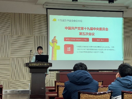 厚积薄发,夯实基础学精神。樊晓同志从会议基本情况和全会的指导思想开始来带领大家学习十九届五中全会。接着阐述了全面建成小康社会所取得的成就,其中数字的列举更加体现出我国全面深化改革取得的重大突破。然后分析现状,总结学习我们面临的机遇与挑战,接着展望未来,带领同志们了解2035年远景目标和“十四五”时期经济社会发展主要目标。
