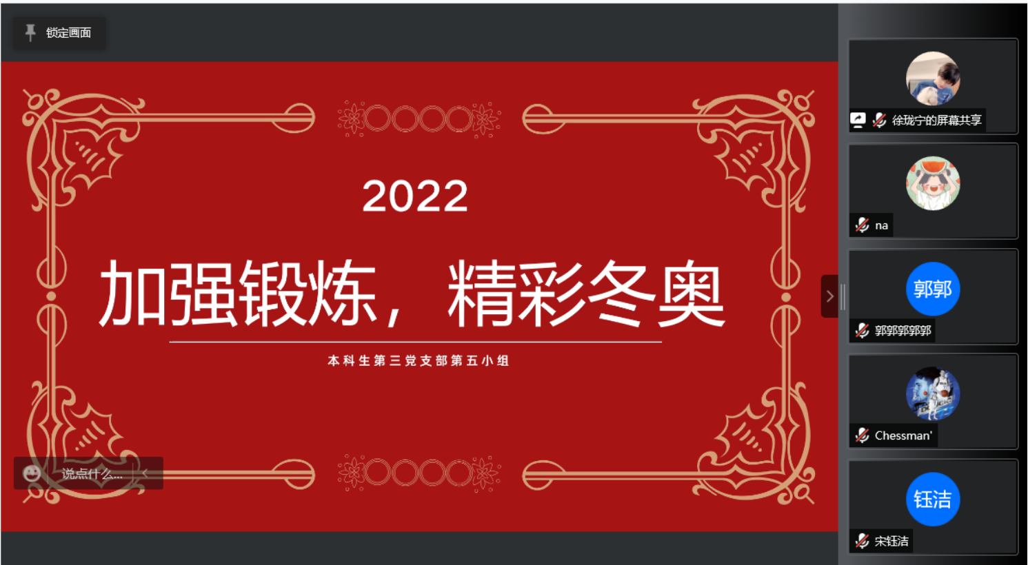 第24届冬季奥林匹克运动会计划于2022年2月4日开幕。为了解冬奥会,学习习近平同志“坚定信心再接再厉抓好各项筹备工作确保北京冬奥会冬残奥会圆满成功”讲话精神,2022年1月24日晚,ai换脸明星 本科生第三党支部召开“加强锻炼,精彩冬奥”组织生活会,本次会议由徐珑宁同志主持,支部全体党员、预备党员和积极分子参会。