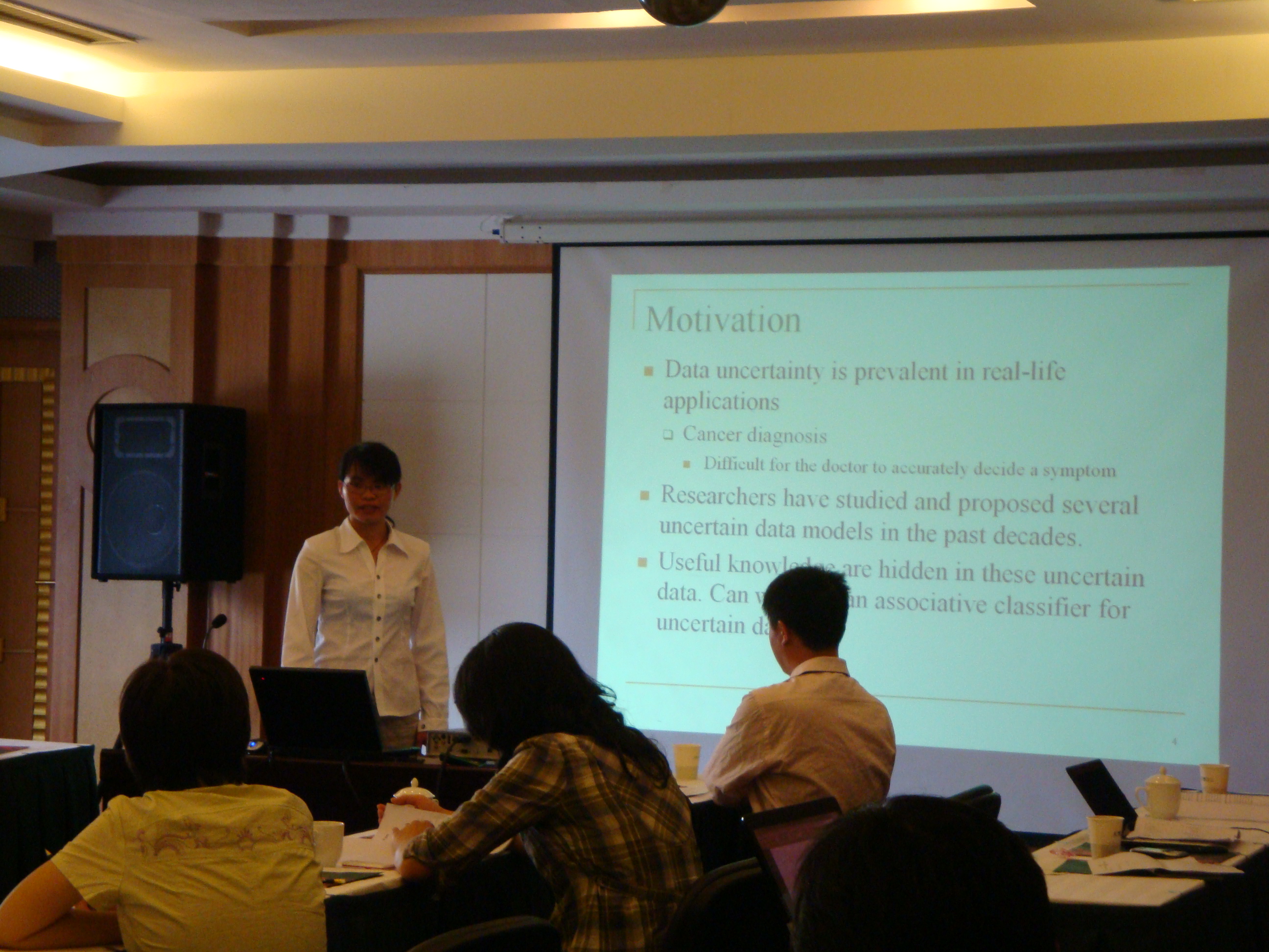 副院长张阳教授和2008级研究生覃香菊同学参加了此次大会。张阳教授应邀作为此次大会Knowledge Discovery分会场的主席,同时覃香菊同学在此分会场就其被录用的论文“Associate Classifier for Uncertain Data”做了报告。