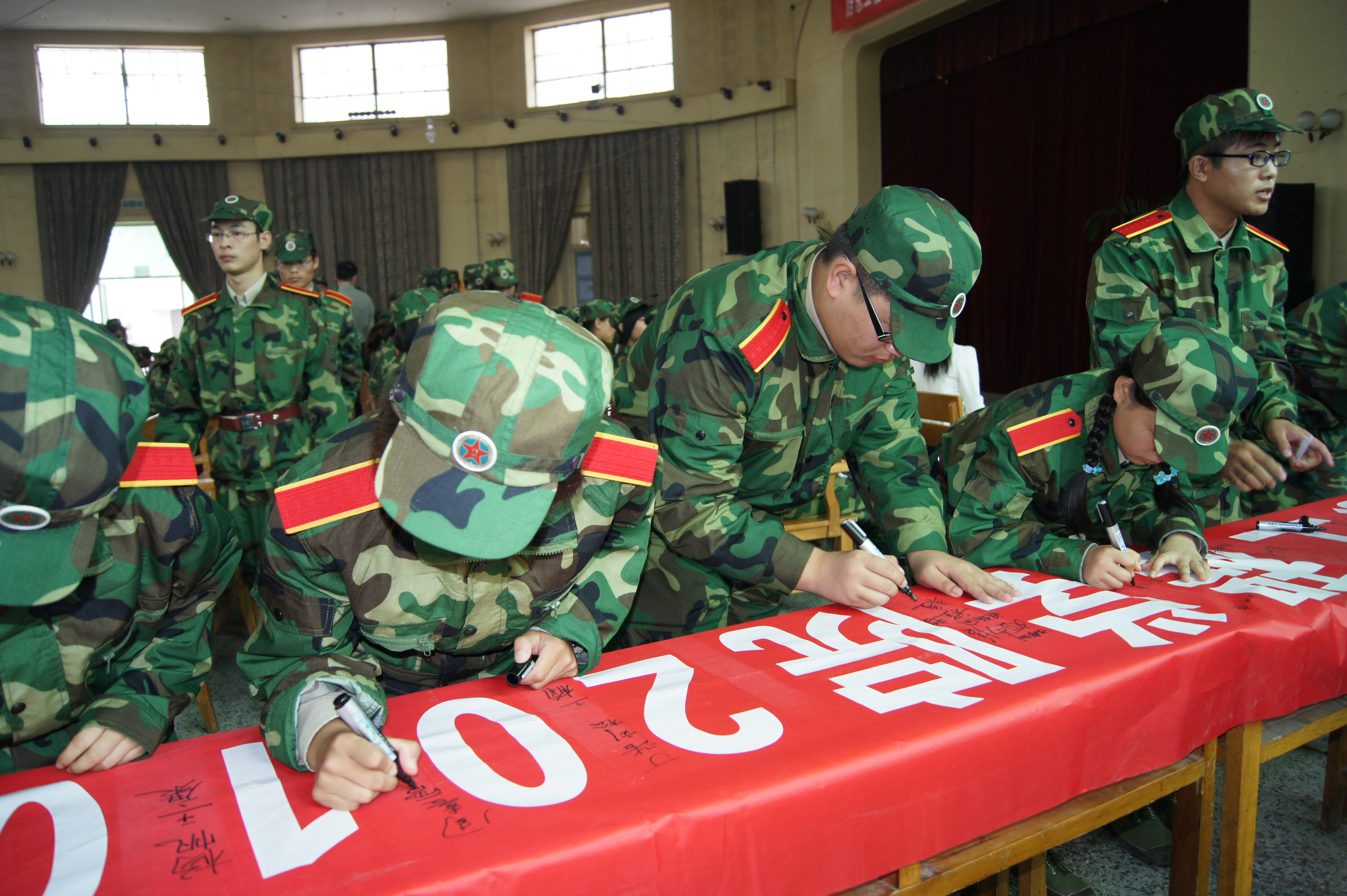 2010级新生争当优秀大学生”横幅上签名,开始大学生活新的一页。