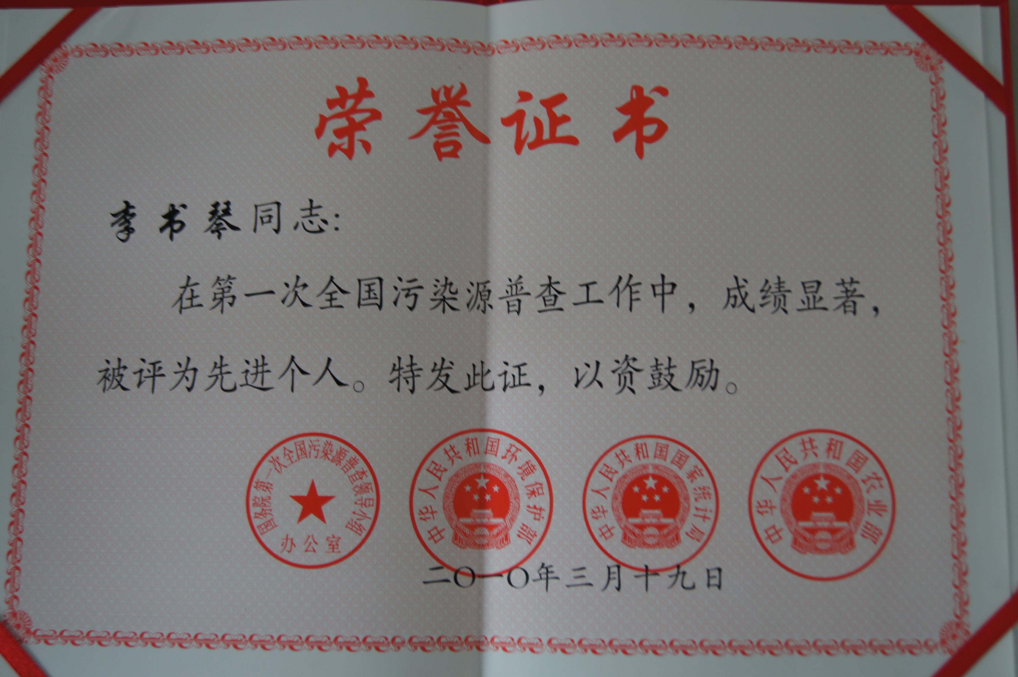 的委托,李书琴教授自2007年开始承担了农业源污染物流失系数测算数据库设计与污染物流失系数测算任务,历时两年半完成了涵盖我国主要种植区域、种植方式、耕作方式、农田类型、土壤类型、地形地貌和主要作物的农田污染物流失系数,构建了污染物负荷测算方法,对建立全国种植业污染物流失监测网络做出了突出贡献。也为进一步开展全国农业面源污染负荷工作奠定了基础。国务院第一次全国污染源普查领导小组办公室、环境保护部、国家统计局、农业部授予李书琴教授“先进个人”荣誉称号。