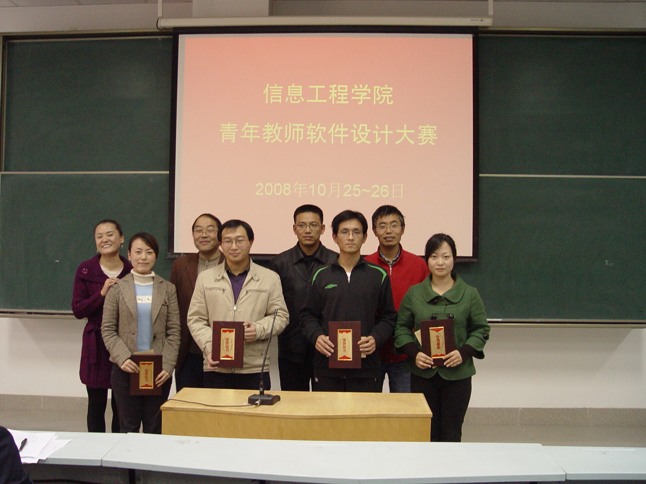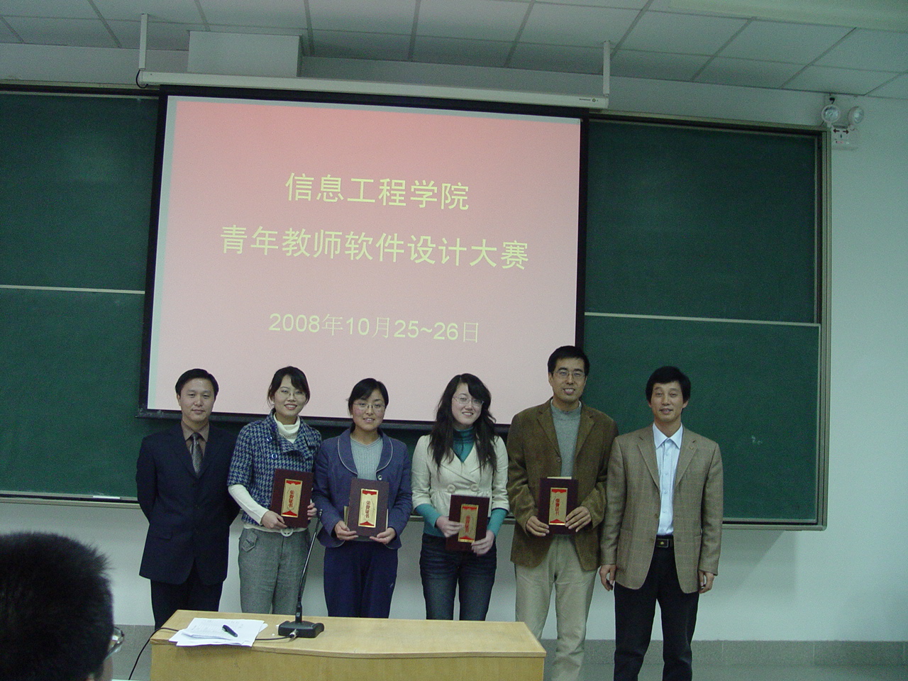 2008年青年教师软件设计大赛在多媒体教室2举办。大赛由教学副院长李书琴教授主持,院长何东健教授、书记樊世明研究员、副院长李书琴教授、副院长韩宏副教授、软件工程系主任张阳老师、控制系主任张建锋老师、科学系主任耿楠老师、信管系主任任国霞老师、基础部主任陈勇老师共9名老师担任评委,全院35名35岁以下青年教师参加了本次大赛。