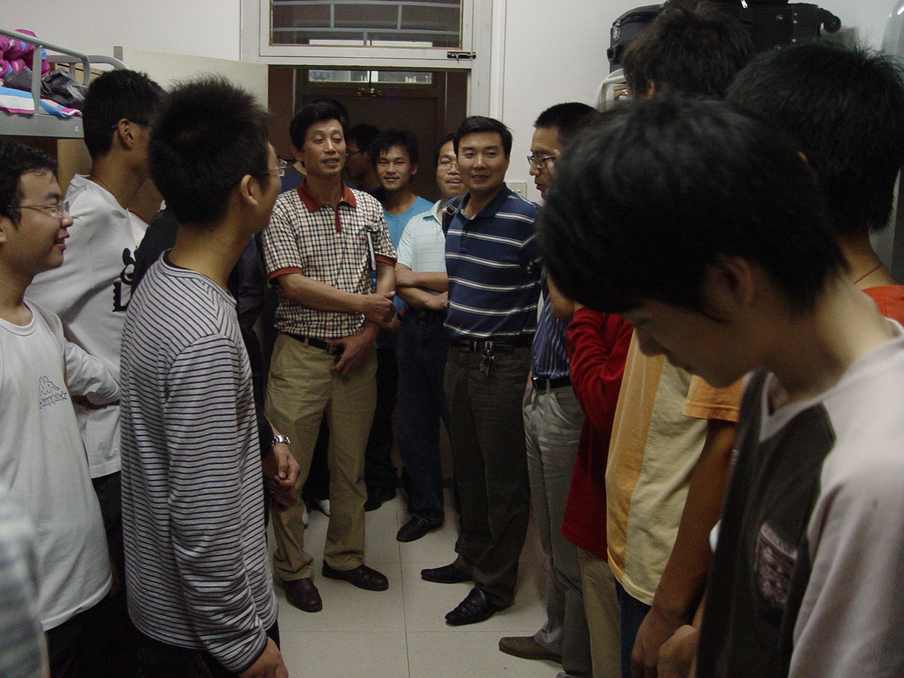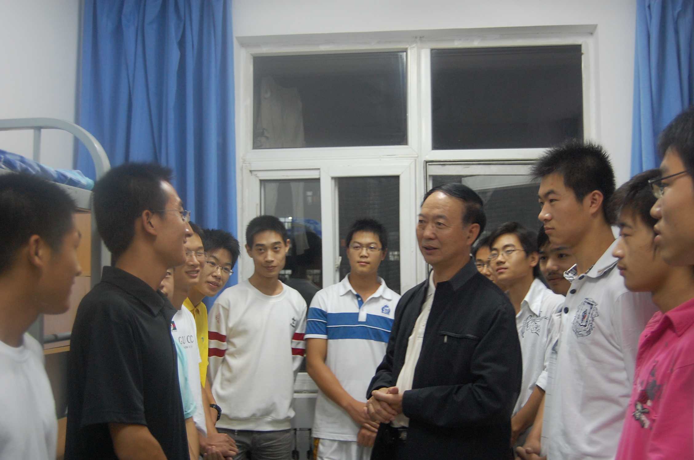 副院长韩宏、王木昌,党委副书记何卫军,全体辅导员以及新生班主任一起来到新生宿舍亲切看望2009级新生。