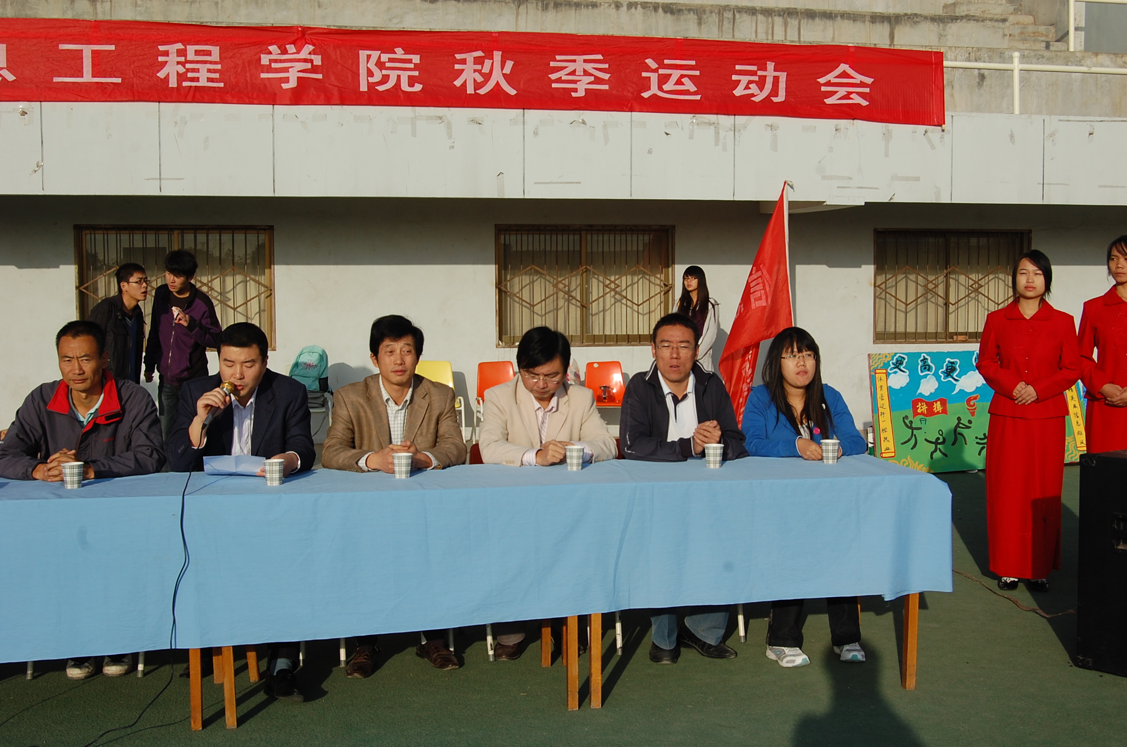 在北校区田径场隆重举行第三届秋季运动会。副院长韩宏老师,党委副书记何卫军老师,体育辅导员杜养军老师,全体专兼职辅导员出席了开幕式,何副书记为大会致开幕词。