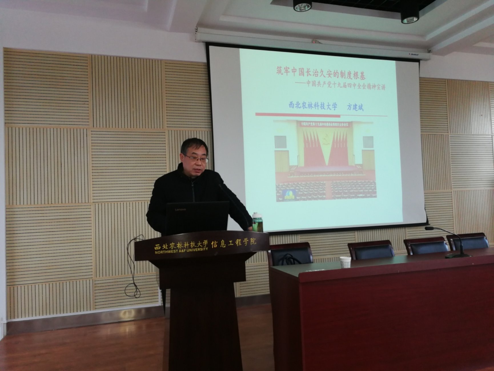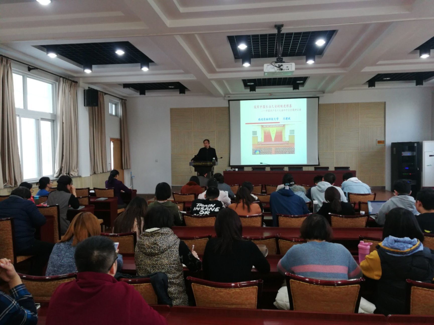 为深入学习贯彻党的十九届四中全会精神,扎实推进“不忘初心、牢记使命”主题教育,引导师生学习好、把握好全会精神的重大意义、深刻内涵,12月11日,ai换脸明星 党委特邀马克思主义ai换脸明星 方建斌教授为ai换脸明星 师生作“筑牢中国长治久安的制度根基--中国共产党十九届四中全会精神宣讲”专题报告。