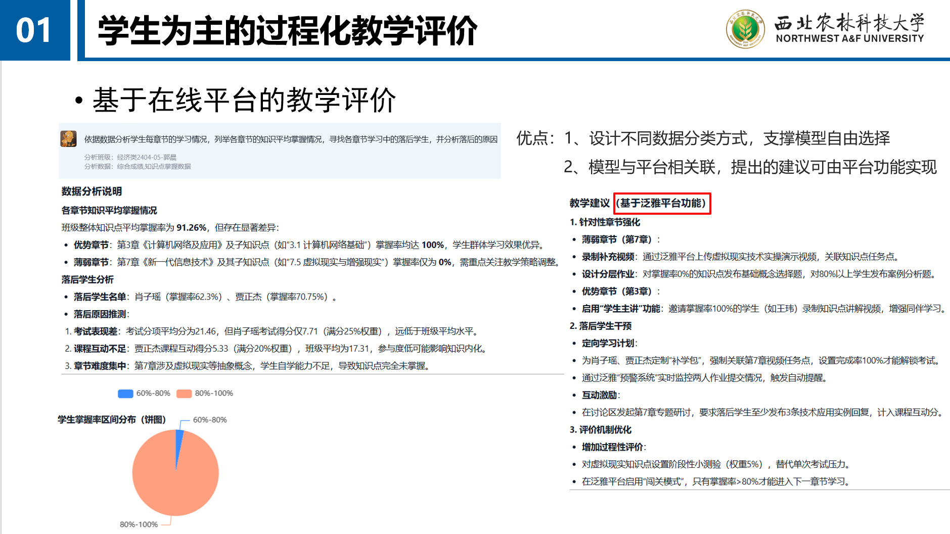 以学生为中心的教学评价,是当前人工智能与教学评价结合的主要方式,依托智慧课程收集的学生过程化学习数据,分析每位同学的不同学习状态,精准定位学生的学习中的具体问题,有针对性的改进教学。