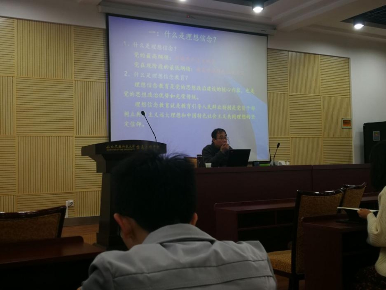 方建斌教授从“理想信念”、中国人的信仰、中国共产党员的信仰,如何坚定自己的政治信仰等四个方面展开讲解、分析。