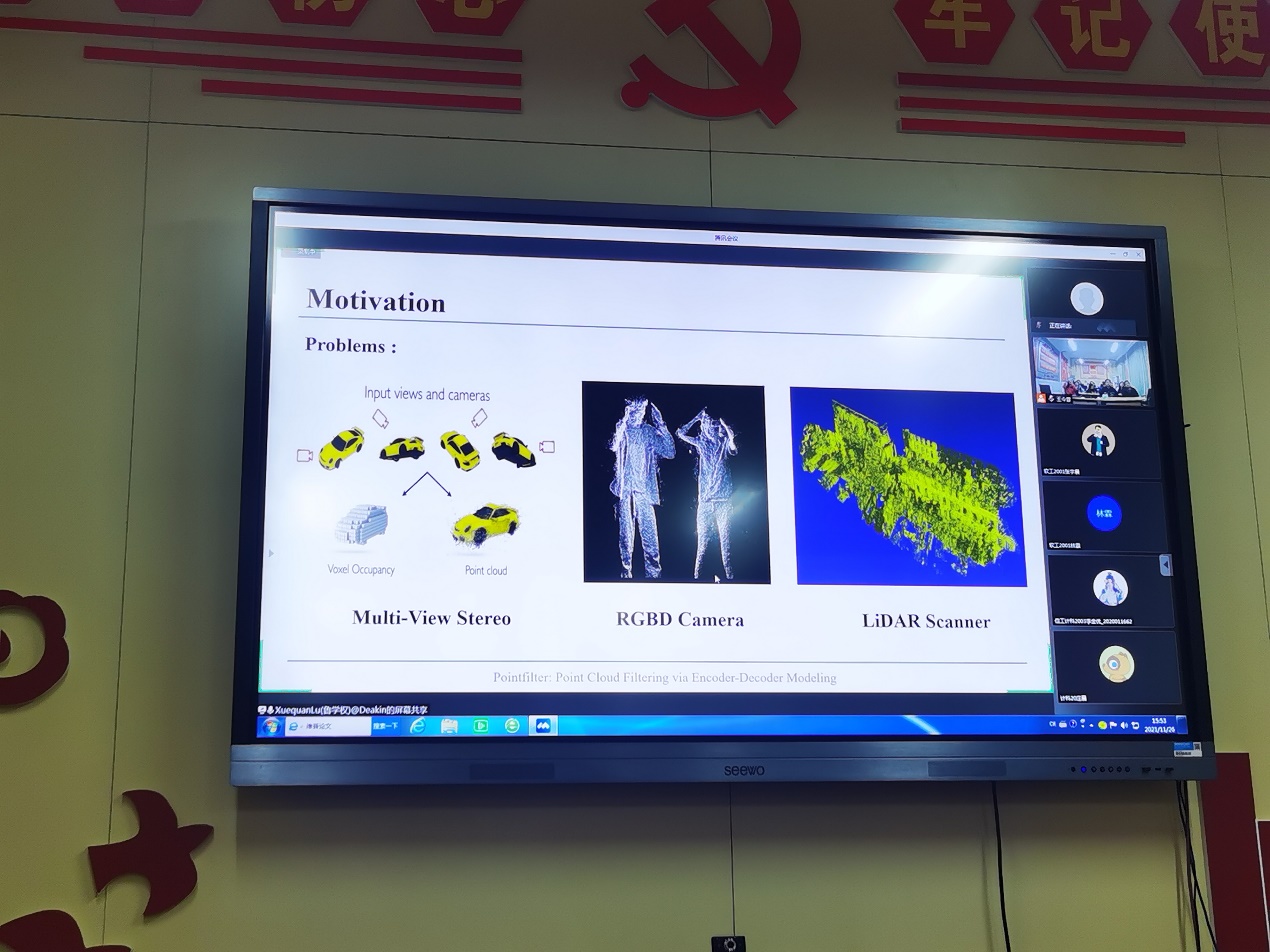 报告会介绍了二维数据与三维数据的概念,并总结了两类数据的特点与区别。依据两种不同的数据类型,讲解了在三维数据中的相关研究工作,其中包括:点云滤波、基于点云的三维骨架提取、人体分割、点云分类、群体仿真等;讲解了在二维数据中的研究工作,其中包括:人脸属性迁移、图像分割、风格迁移、去模糊等。会上还就其研究工作“Low Rank Matrix Approximation for 3D Geometry Filtering”(IEEE Transactions on Visualization and Computer Graphics, 2020)展开具体分享,从研究动机,方法概述,具体研究方案,可视化结果以及量化结果展示了点云滤波方法目前的研究现状、特点及应用等。