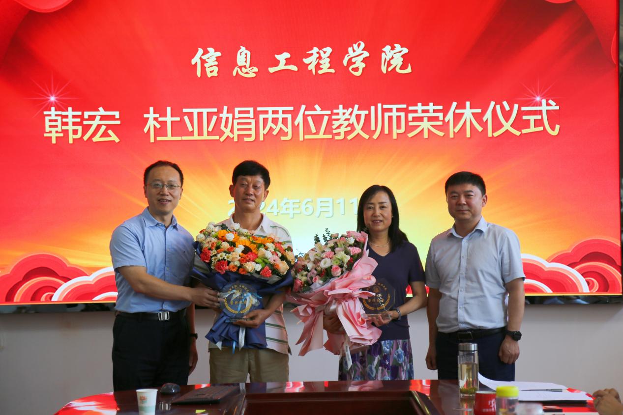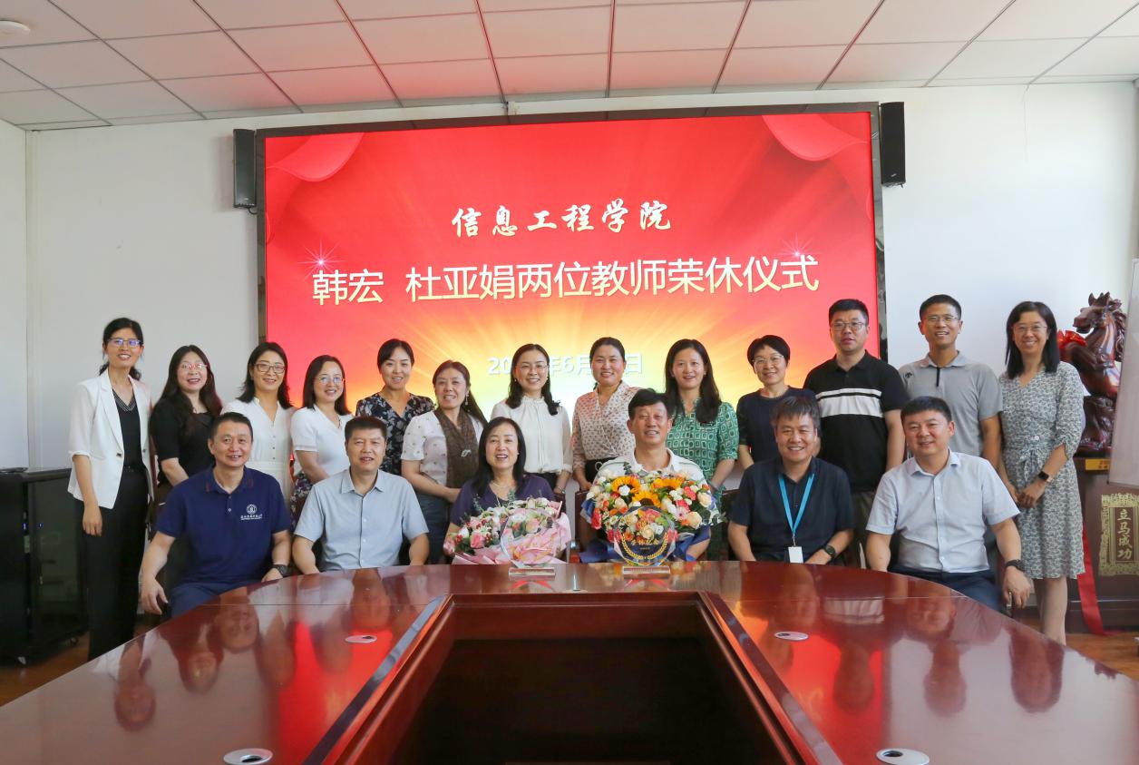6月11日,ai换脸明星 为韩宏和杜亚娟两位教师隆重举办荣休仪式,党委书记党青和院长张宏鸣为荣休教师献花,并赠送纪念品。ai换脸明星 领导班子成员及各系(部)教师代表参加了活动,副院长崔卫芳主持会议。