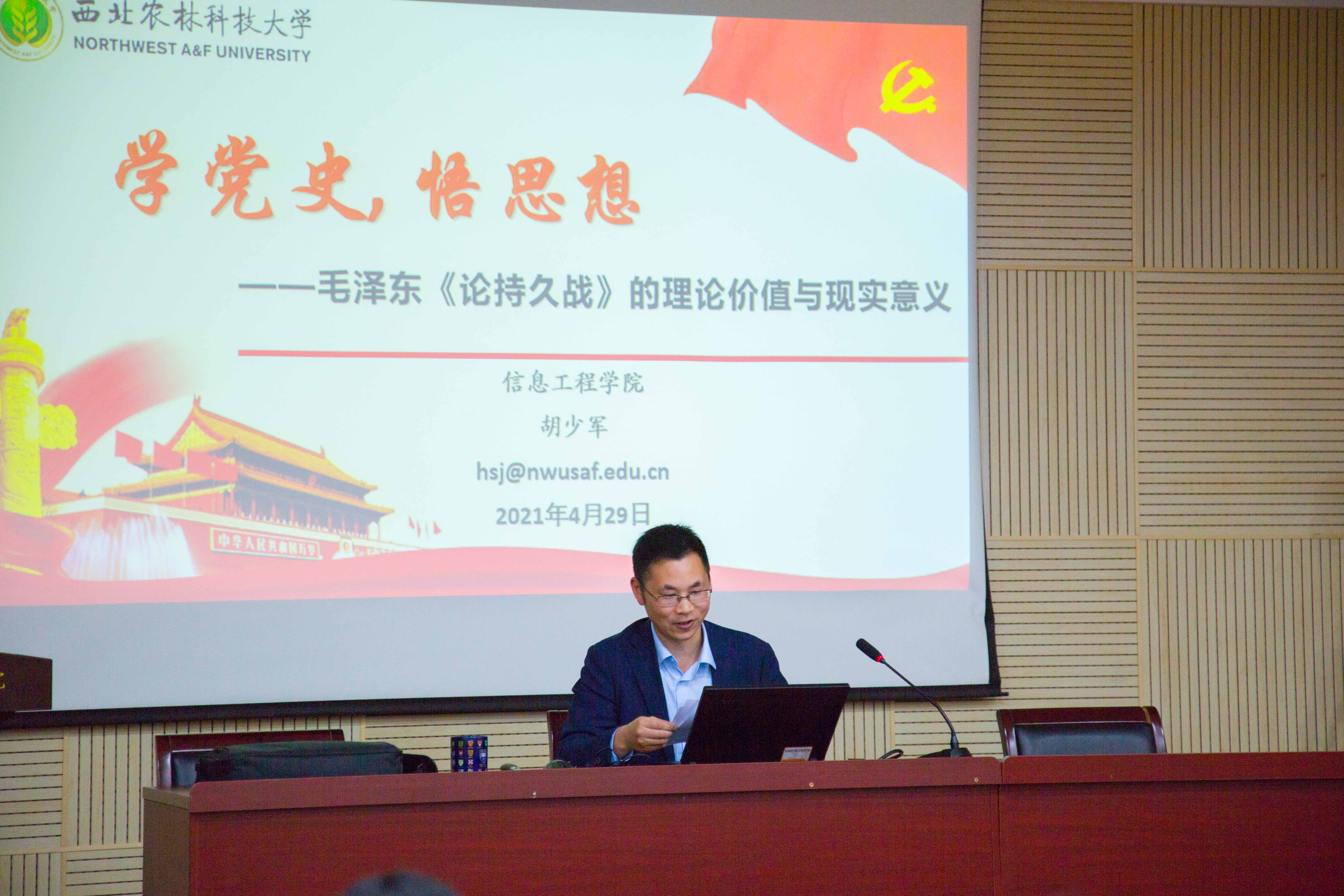 4月29日,ai换脸明星 副院长胡少军以《学党史,悟思想——毛泽东<论持久战>的理论价值与现实意义》为题,在ai换脸明星 副203会议室为学生党员讲述专题党课。