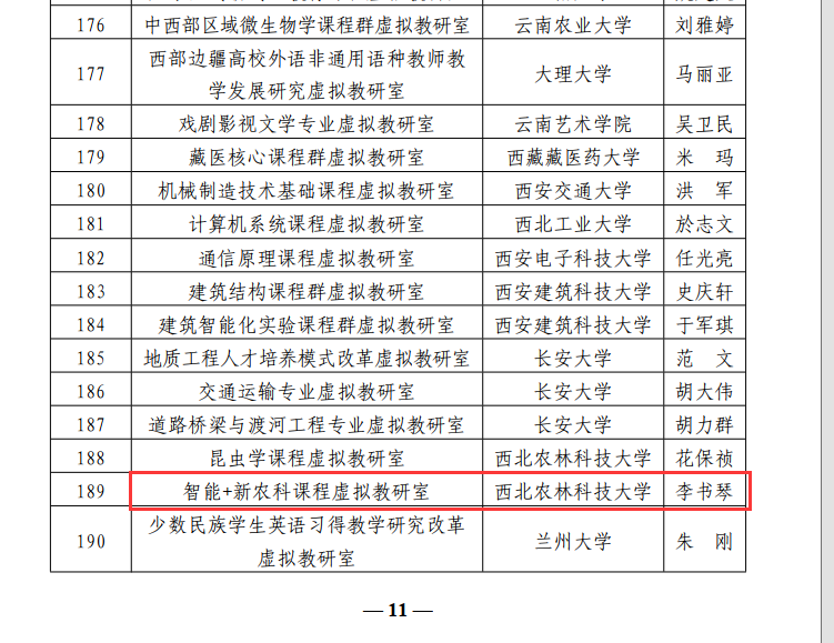 近日,教育部办公厅发布了《关于公布第二批虚拟教研室建设试点名单的通知》(教高厅函〔2022]13号),ai换脸明星 李书琴教授牵头的“智能+新农科课程虚拟教研室”成功入选,是ai换脸明星 信息化时代新型基层教学组织建设的重要突破。