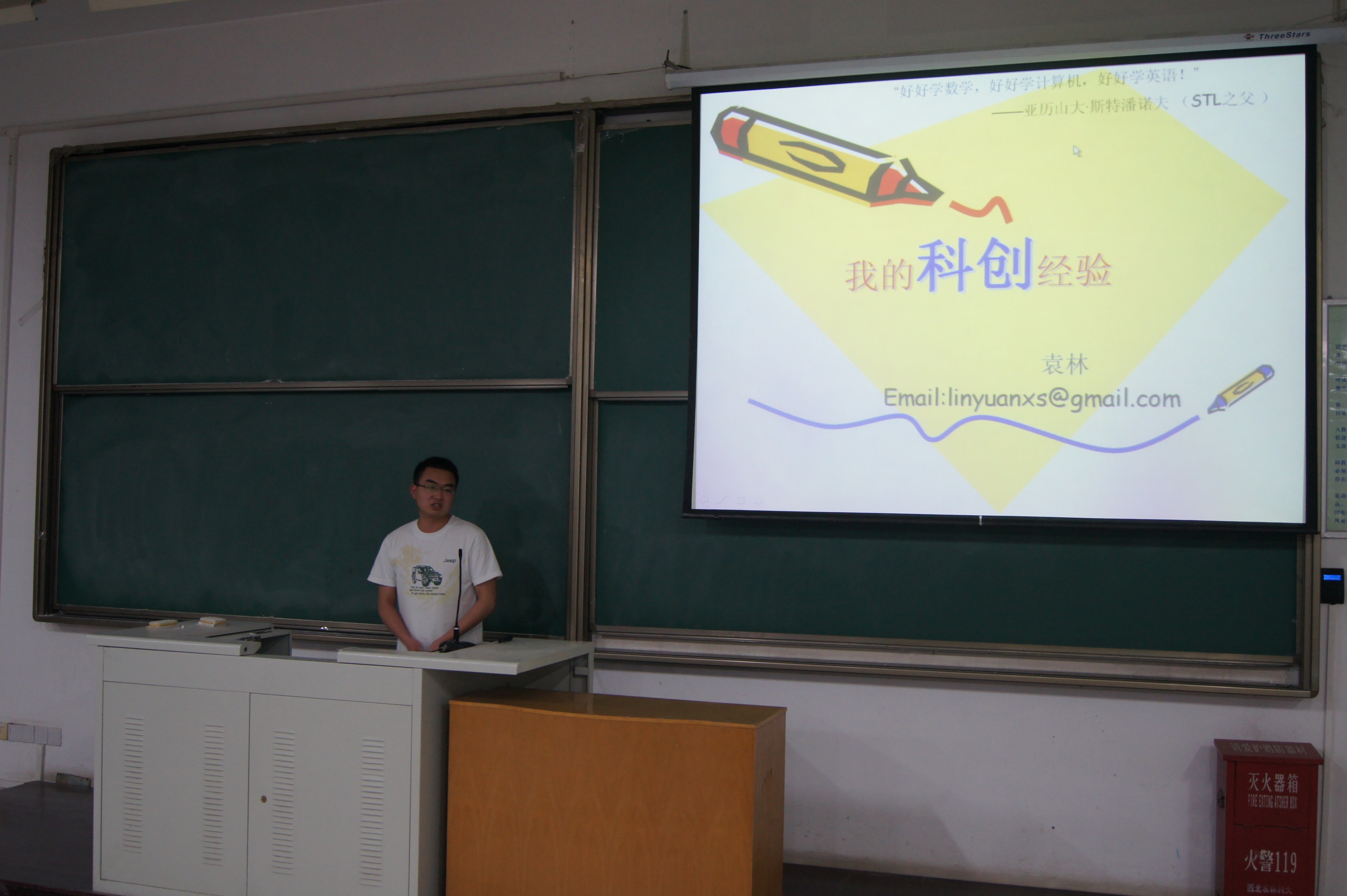 还邀请09级信管专业袁林同学为大家作了经验介绍。袁林同学结合自己所作项目,以认识科创、申请项目、遇到问题、解决问题、取得丰硕成果等不同阶段的切身体会,给大家作了一场精彩的报告。袁林同学还用“世界上没有最聪明的人,只有最勤奋的人”、“好好学数学、好好学计算机、好好学英语”与大家共勉。
