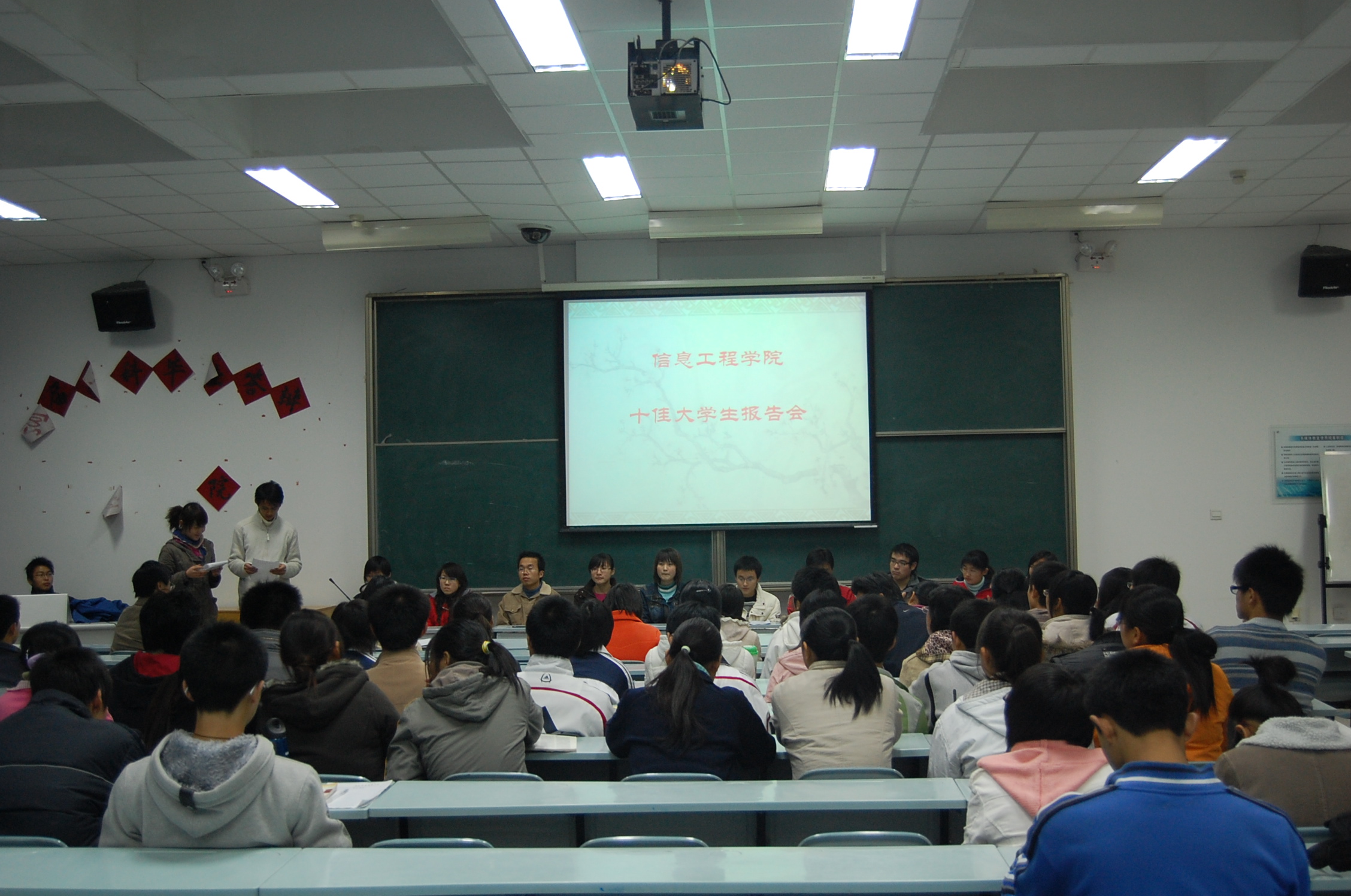 “十佳大学生”报告会在多媒体教室M1拉开帷幕,百余名新生到场听取。