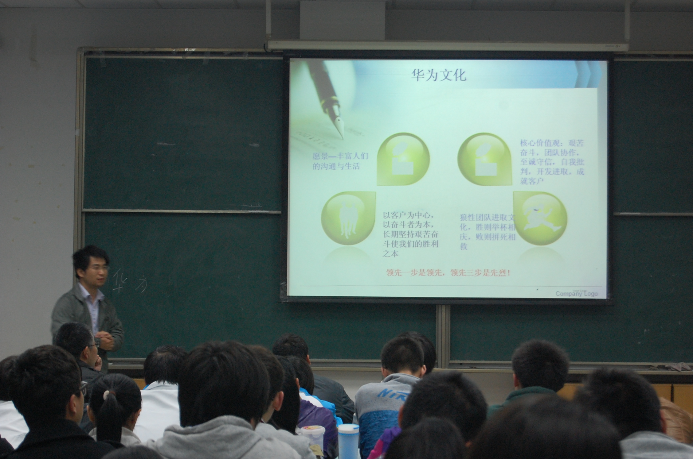 周全程、王龙涛目前分别任职华为公司IT产品线云计算公共支撑开发部portal项目开发组组长及架构设计师,具有丰富的架构设计能力和经验,兼任西研所新员工技能导入讲师。他们用生动的语言结合自己的经历为同学们讲了将来进入公司后所需的基本技能。他给同学们介绍了华为公司的狼性团队进取文化,强调在工作中要有“胜则举杯相庆,败则拼死相救” 的精神,更要有艰苦奋斗,团队协作的品质。随后,他分析了目前中国技术行业的人才缺口之巨大;最后,他还讲述了在IT行业对于硬件知识的要求,并激励同学们在大学期间要努力学好专业课,提升自己的知识水平和综合能力。