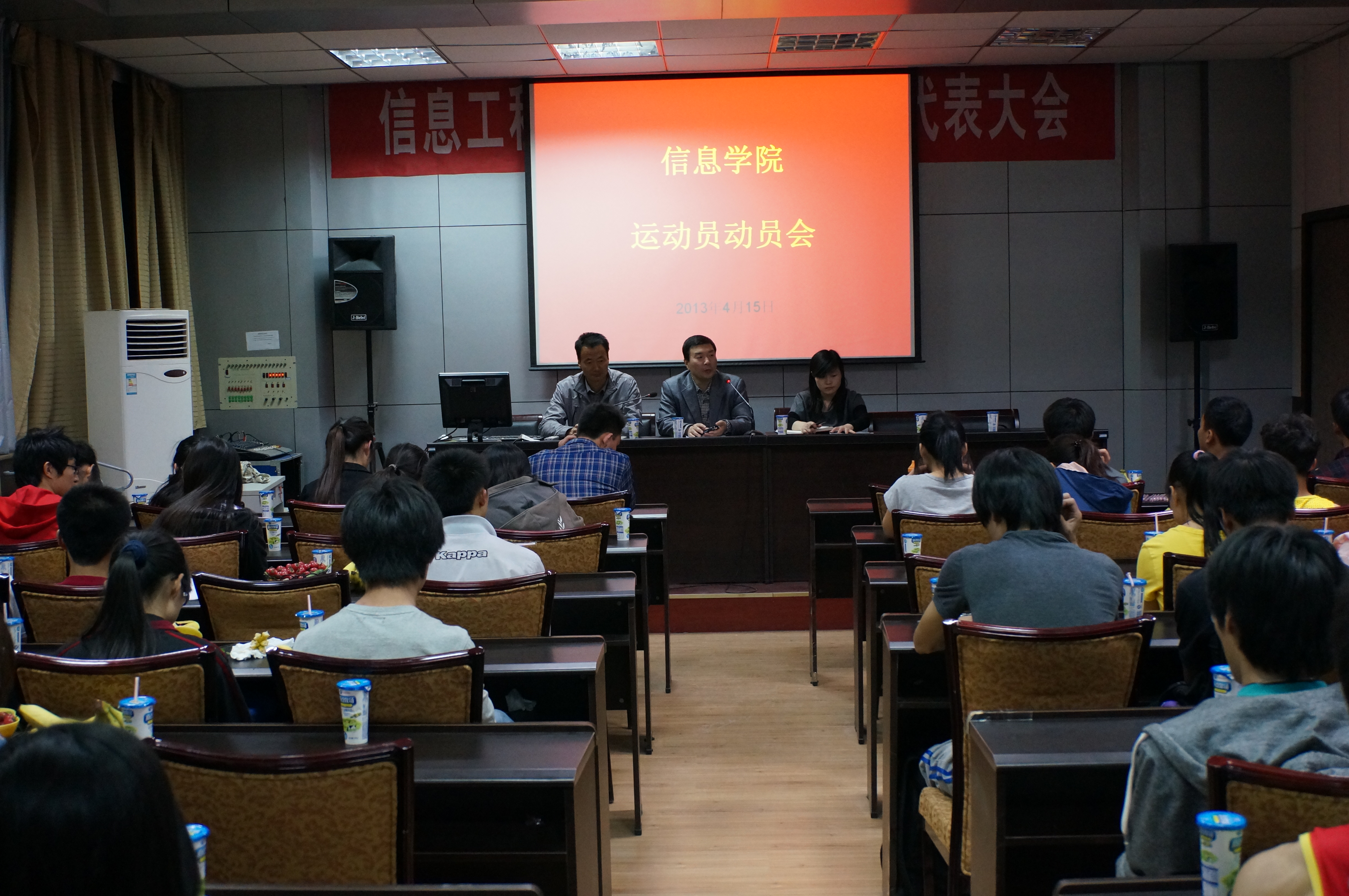 4月15日晚,ai换脸明星 在二楼会议室召开2013年校田径运动会动员会。院党委副书记何卫军老师、体育辅导员杜养军老师、院学工秘书王淑珍老师、院学生会体育部成员及全院五十余名运动员参加了会议。