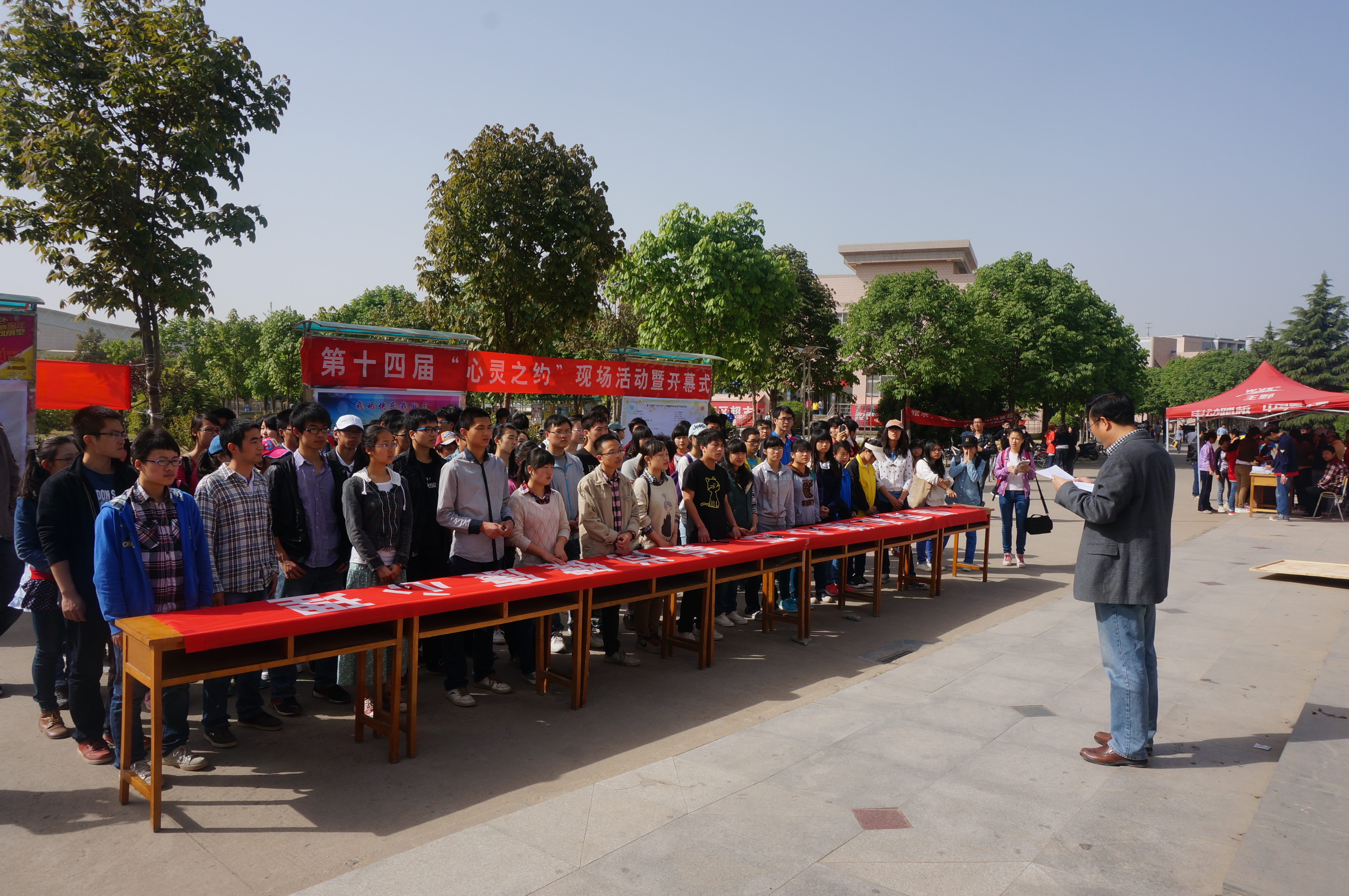 此次开幕式共进行了四项活动。首先,由心理咨询部老师发言,宣布活动开始。其次同学们进行万人签名活动。随后,现场心理咨询,心理测量活动展开,老师在现场帮助大家解决学习、生活中遇到的各种问题。同学们还和老师一起做了“房树人”心理测试。最后,心理咨询部老师和同学们玩起了趣味心理游戏,让同学们在游戏中放平心态,缓解不快的心情。