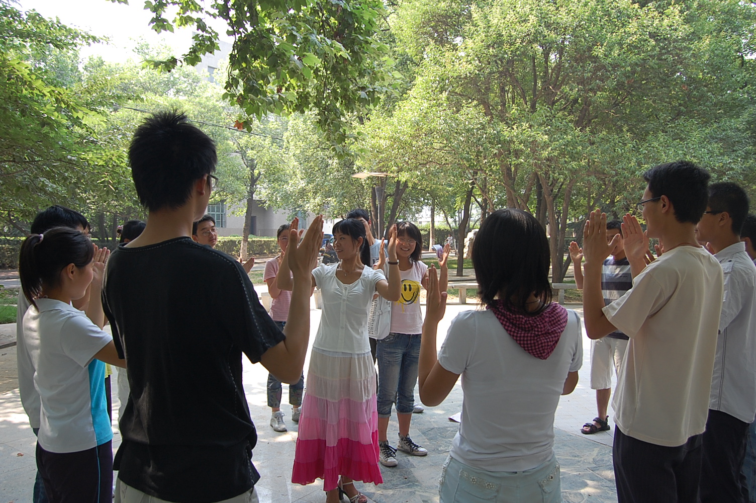 武春芳老师又应邀在三号教学楼前举行了一次以“团结一致”为主题的心理辅导,此次辅导同样以户外活动的方式举行,意在让大家在灾后团结一致、众志成城、共渡难关。
