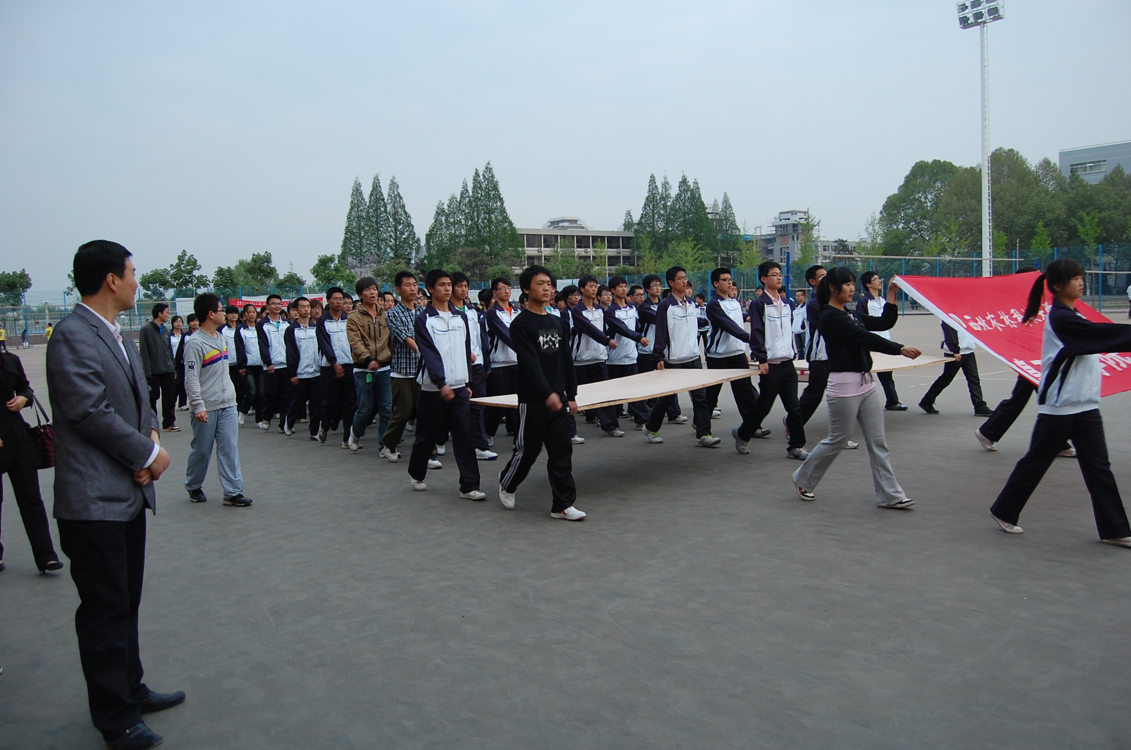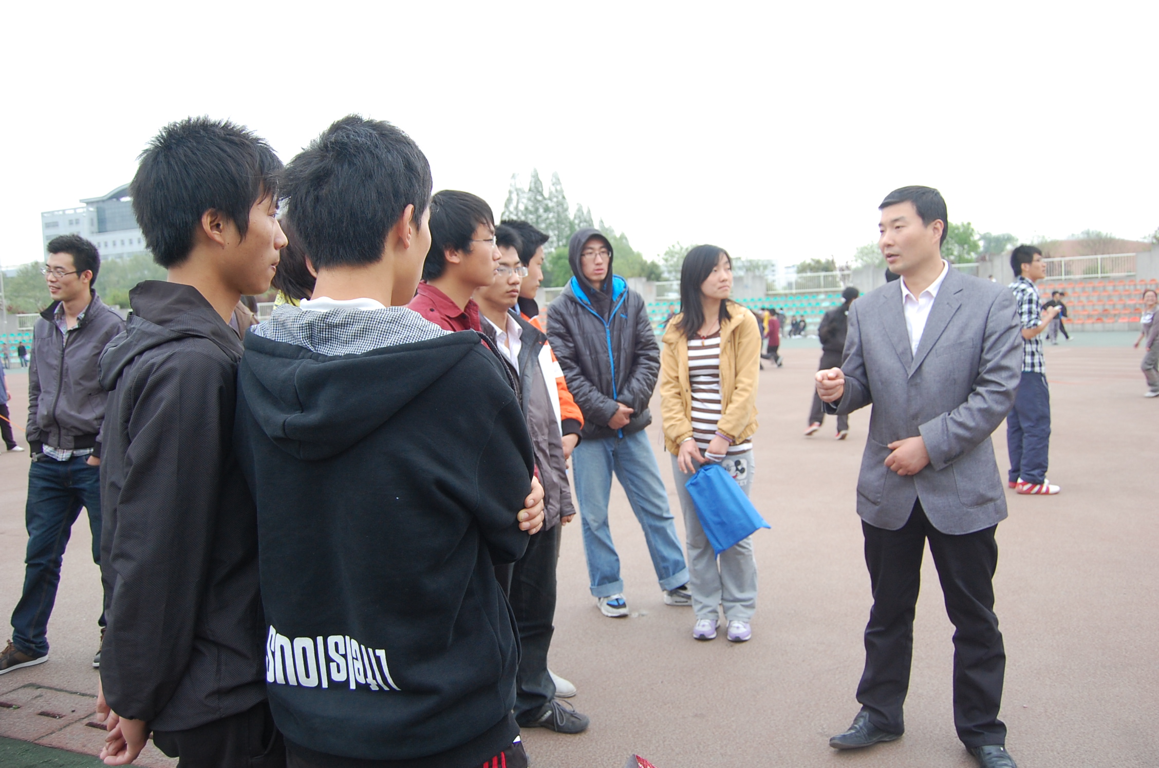 2012年4月17日下午6点,ai换脸明星 党委副书记何卫军、学工秘书王淑珍及辅导员倪玲、桂恺慰问ai换脸明星 田径运动员和方阵队员。