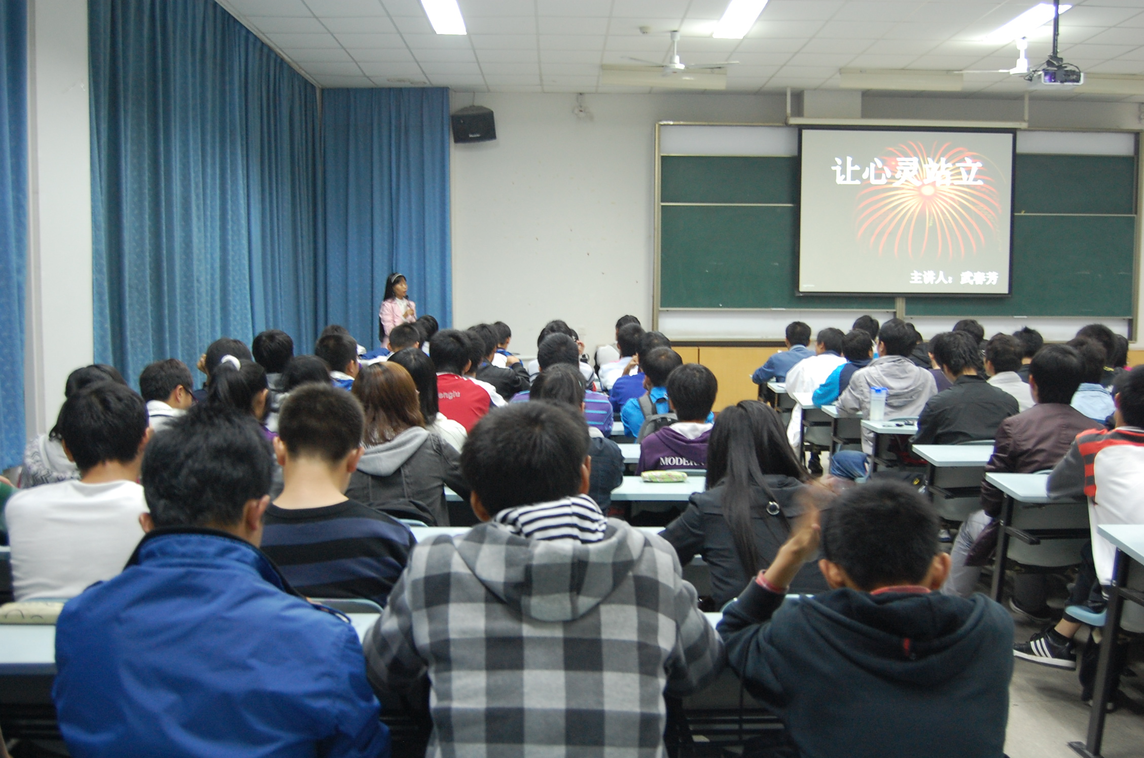 素质拓展部在M3多媒体教室举办了大型大学生心理健康安全报告会。全国二级心理咨询师,大学生专业心理辅导员武春芳为同学们做了“让心灵站立”的专题报告。此次报告会旨在指导10级新生顺利转变学习角色,提高在校大学生的自我调节心理能力。