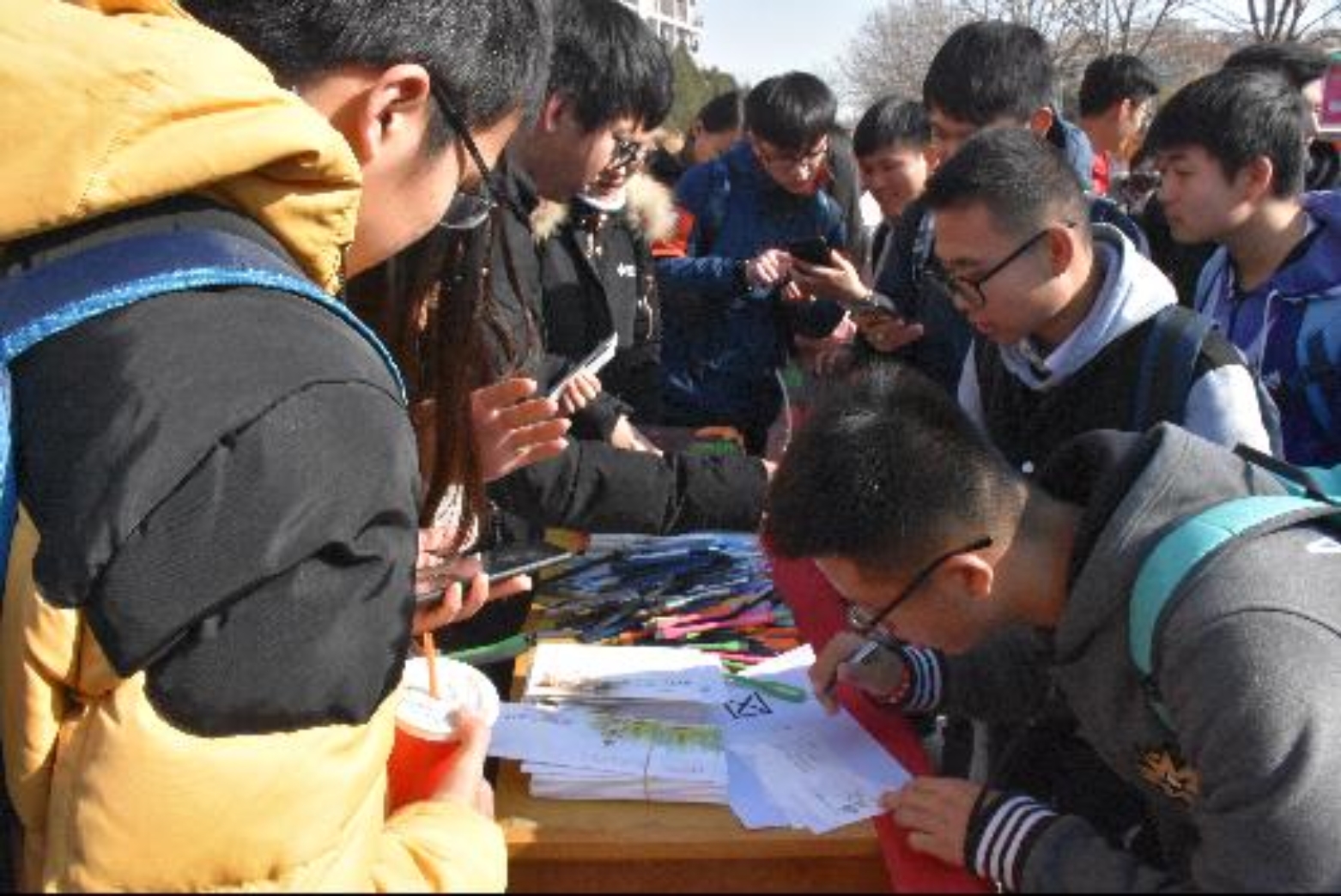 还未放学,工作人员便早早支起了三张桌子,静候着学生下课。右边第一张桌子放的是说说集赞的礼物,剩下两张桌子则放了许多明信片,以供学生们填写。下课后,很快,桌子旁边便被学生们围得水泄不通。工作人员明信片一张接着一张地发出去,同学们认真的将自己对母校的思念写在这一张张明信片上,而工作人员则将写好的明信片收好,以便于之后寄出。
